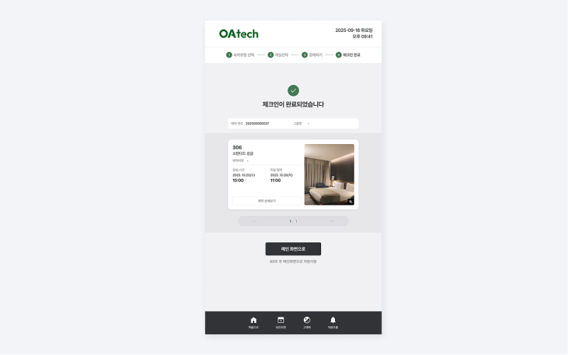 예약 확인: 예약번호, 이름, QR코드, OTA 예약번호 등으로 예약 내역을 조회합니다.