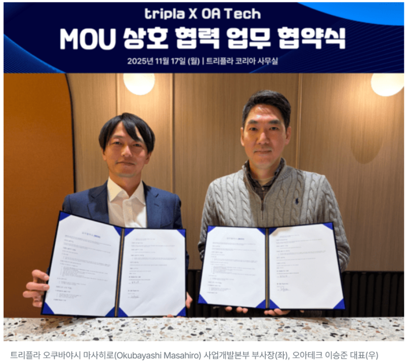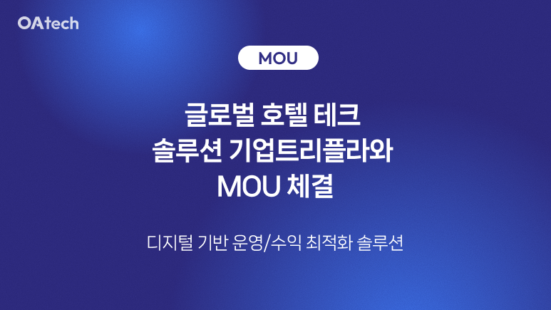 글로벌 호텔 테크 솔루션 기업 트리플라(tripla Co., Ltd.)는 한국 숙박 운영 IT 솔루션 전문 기업인 오아테크(OA Tech Inc.)와 한국 호텔 및 숙박산업의 디지털 전환을 지원하기 위한 전략적 업무협약(MOU)을 체결했다고 발표했다.